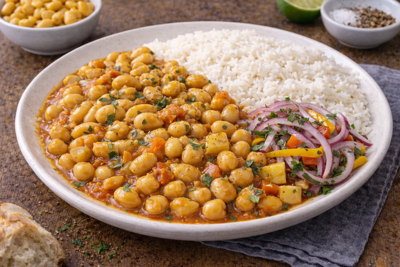 Frejoles canarios baratos con arroz y ensalada criolla