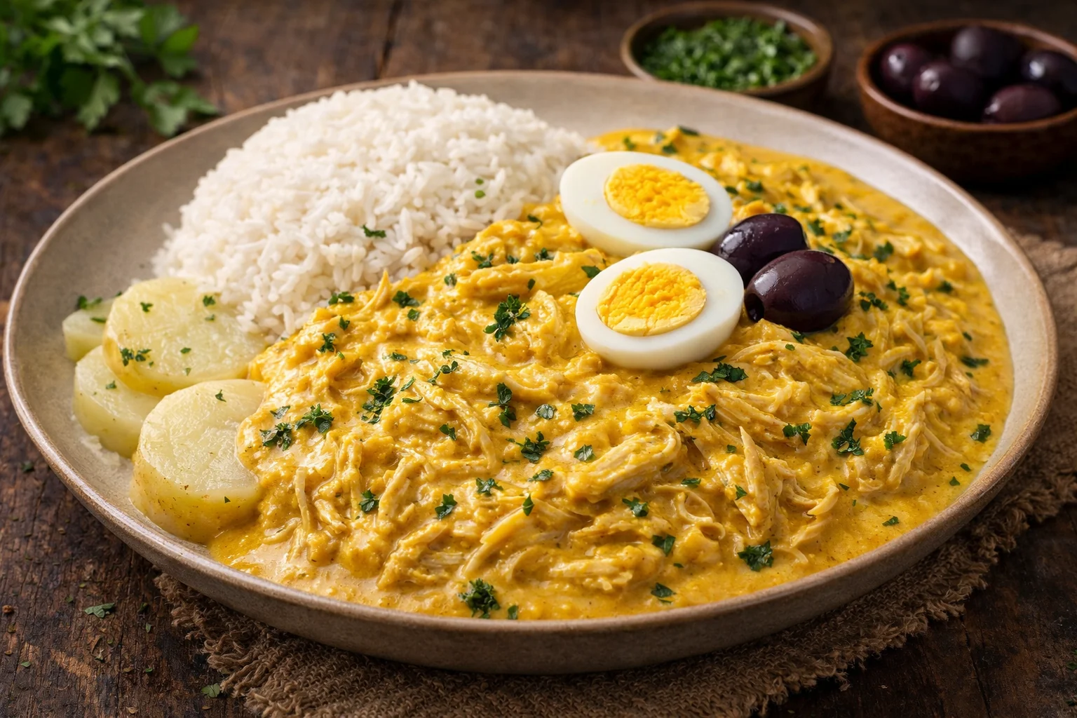 Porque combina tres cosas difíciles de superar: es reconfortante, rendidora y muy adaptable. La crema de ají amarillo con pan (u otro espesante), leche y queso crea una salsa suave y sabrosa que “abraza” el pollo deshilachado. Y como se sirve con arroz, papa y un toque de aceituna/huevo, termina siendo un plato completo, ideal para compartir.
