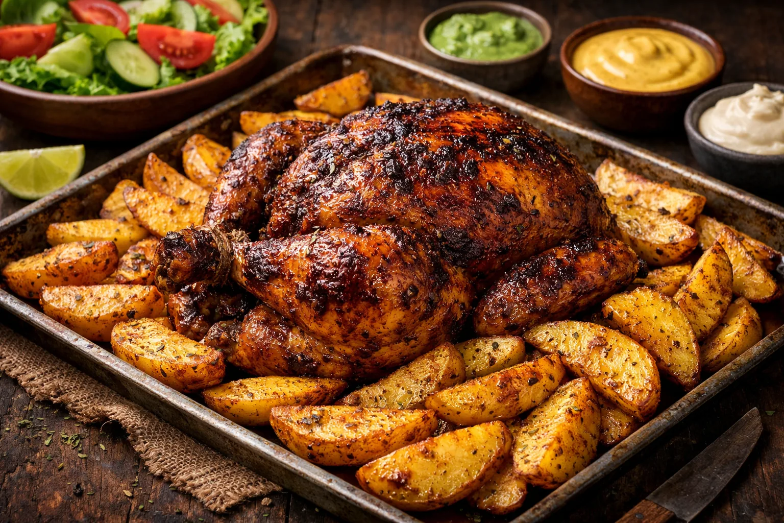 Retira el pollo y deja reposar 10 minutos antes de cortar. Sirve con papas doradas, ensalada y cremas.